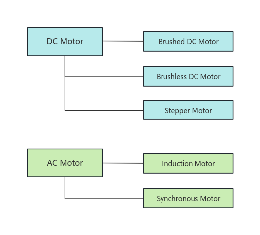 Motors are divided into the following types based on their type of power supply (AC or DC) and the method they use to produce rotation. Below, we briefly describe the characteristics and uses of each type.
