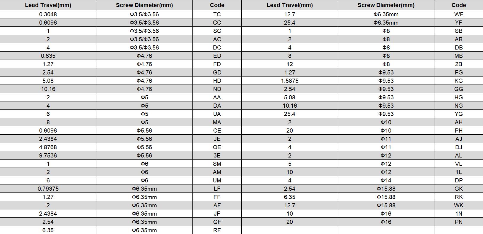 | ⑧ Lead Screw/Ball Screw Code | Please see below lead screw code selection table individually | ||||||||